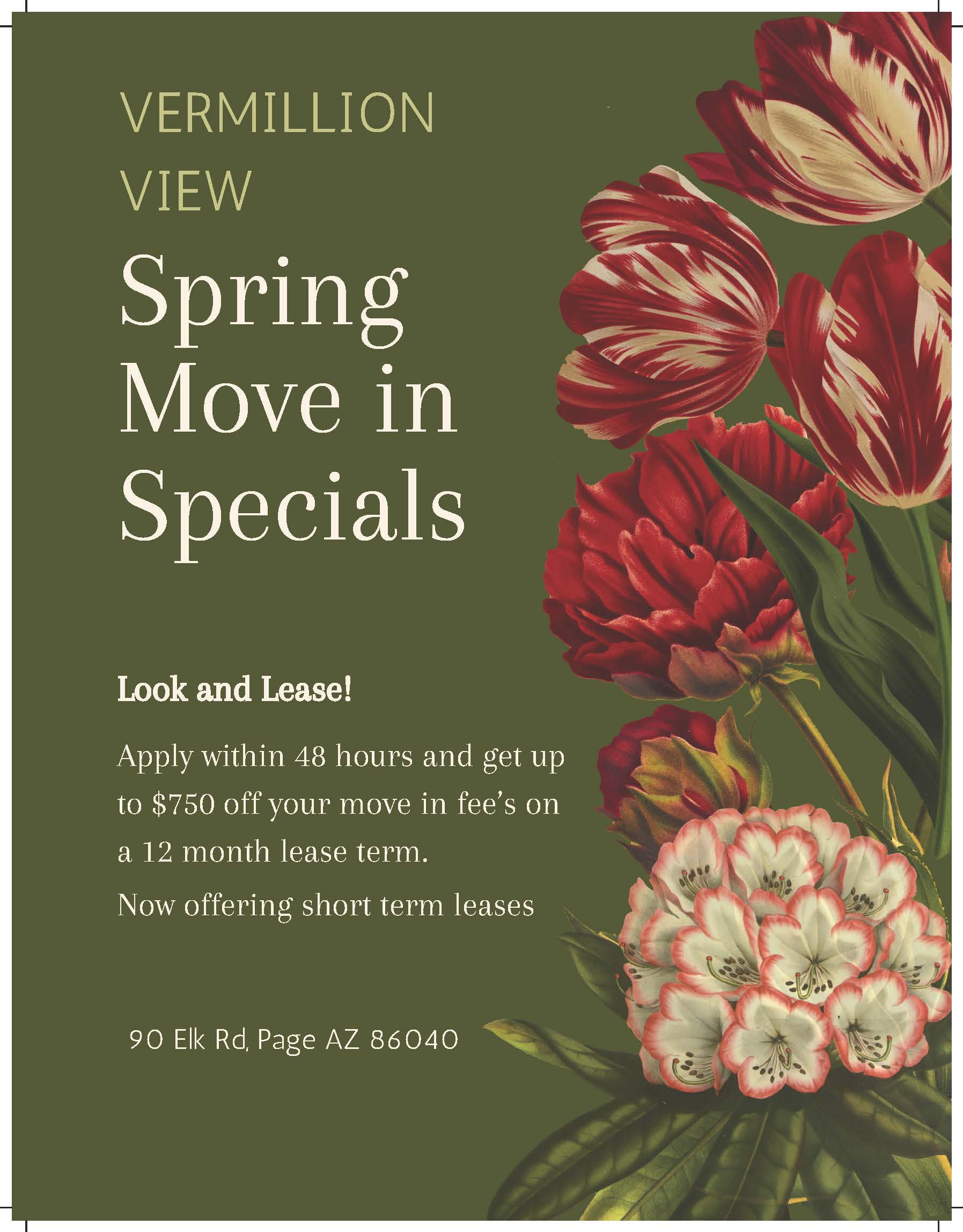 For a limited time, new residents who sign a 12-month lease will receive $750 off their move-in fees, and new residents who sign a 6-month lease or less will receive $250 off their move-in fees when they apply within 48 hours of touring and are approved!